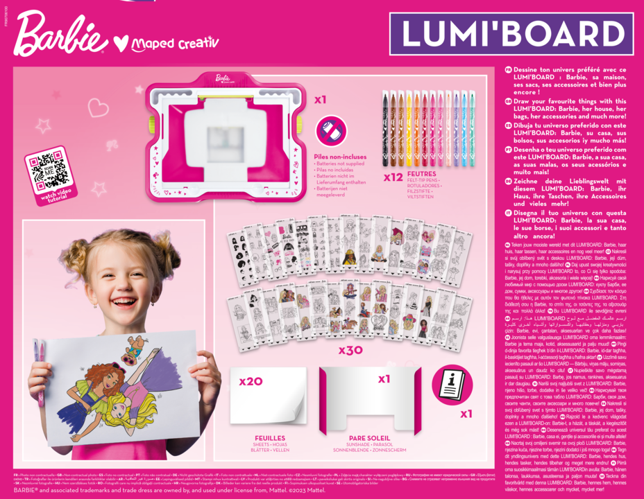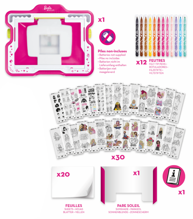 Caja que contiene: 1 máquina de dibujo iluminada Lumi Board Barbie, 30 tarjetas de plástico con modelos para transferir, 12 rotuladores, 20 hojas blancas A4, 1 parasol.